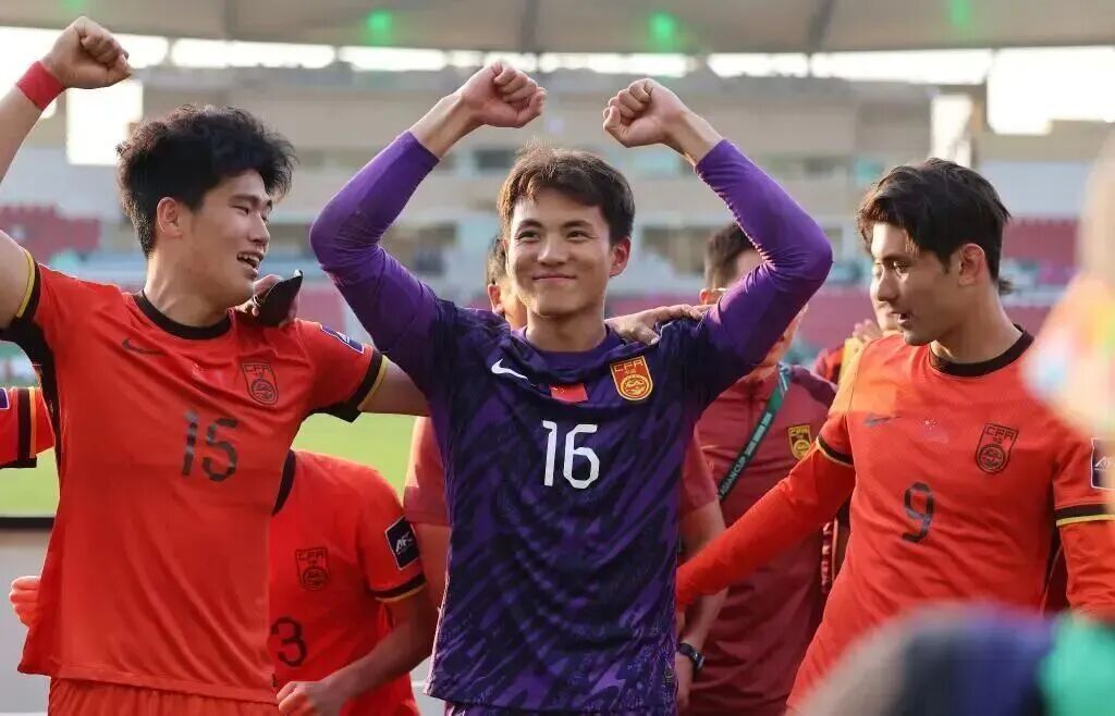 2026年1月17日,U23亚洲杯1/4决赛,中国队点球大战淘汰乌兹别克斯坦后,李昊(中)与队友庆祝。(起首:新华社)