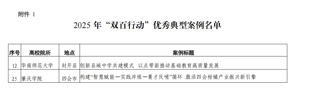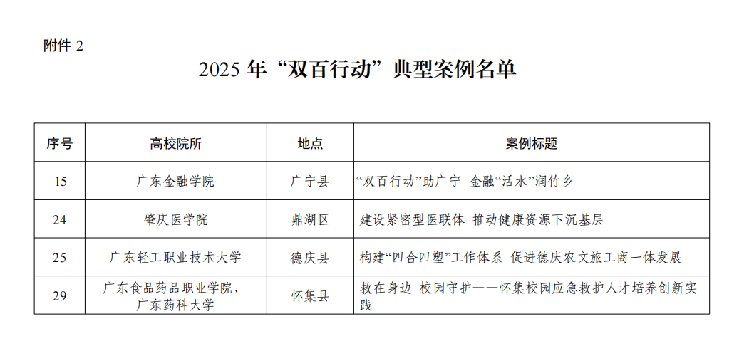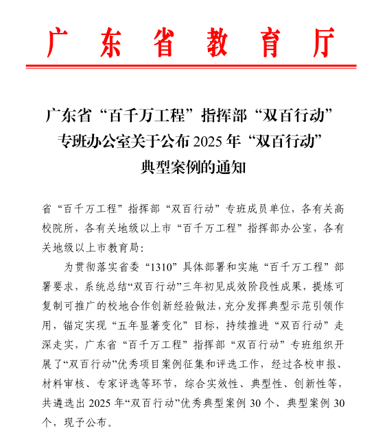 为贯彻落实省委“1310”具体部署和实施“百千万工程”部署条目,系统纪念“双百步履”三岁首见见效阶段性后果,索取可复制可实施的校地联结鼎新熏陶作念法,充分证据典型示范引颈作用,锚定收场“五年权贵变化”指标,抓续鼓吹“双百步履”走深走实,广东省“百千万工程”指挥部“双百步履”专班组织开展了“双百步履”优秀技俩案例搜集和评比责任,过程各校呈报、材料审核、人人评比等措施,概括实效性、典型性、鼎新性等,共彩选出2025年“双百步履”优秀典型案例30个、典型案例30个。